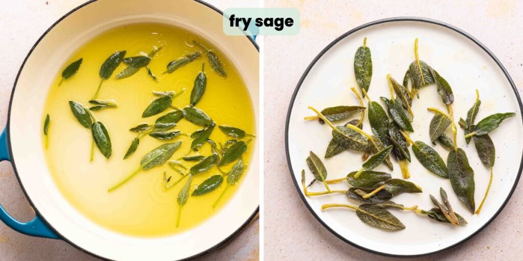 - Sage: Place a large pan, skillet or casserole dish over a medium-high heat. Add 1-2 tbsp oil and heat until hot and simmering. Add the sage leaves to the oil in a single layer and fry 1-2 minutes. Flip about halfway through to crisp up both sides. Remove with a slotted spoon and set aside on a paper towel lined plate. Sprinkle with a pinch of salt and set aside.
