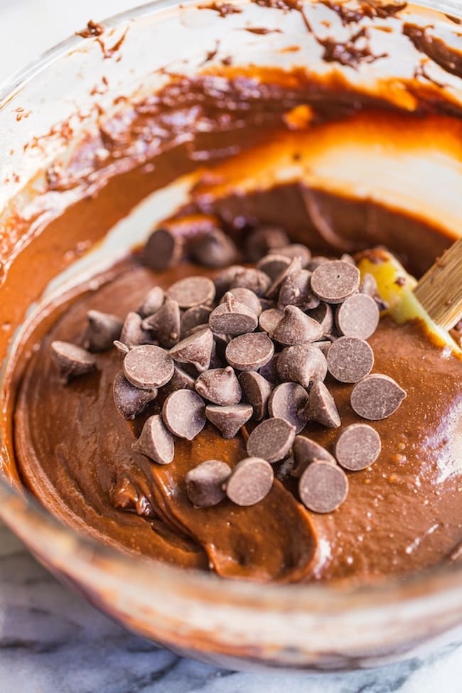 - Stir in the chickpea flour, cocoa powder and baking soda. Mix until you have a thick, fully mixed batter. Stir in the chocolate chips.