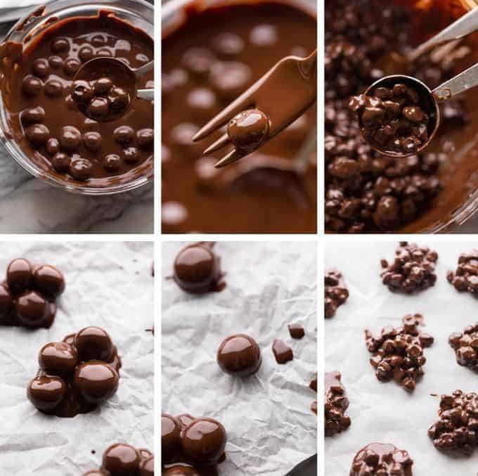 Whether your making clumps or individual pieces, make sure that you allow excess melted chocolate to drip off the back of a spoon or fork, back into the bowl before setting them out to dry.