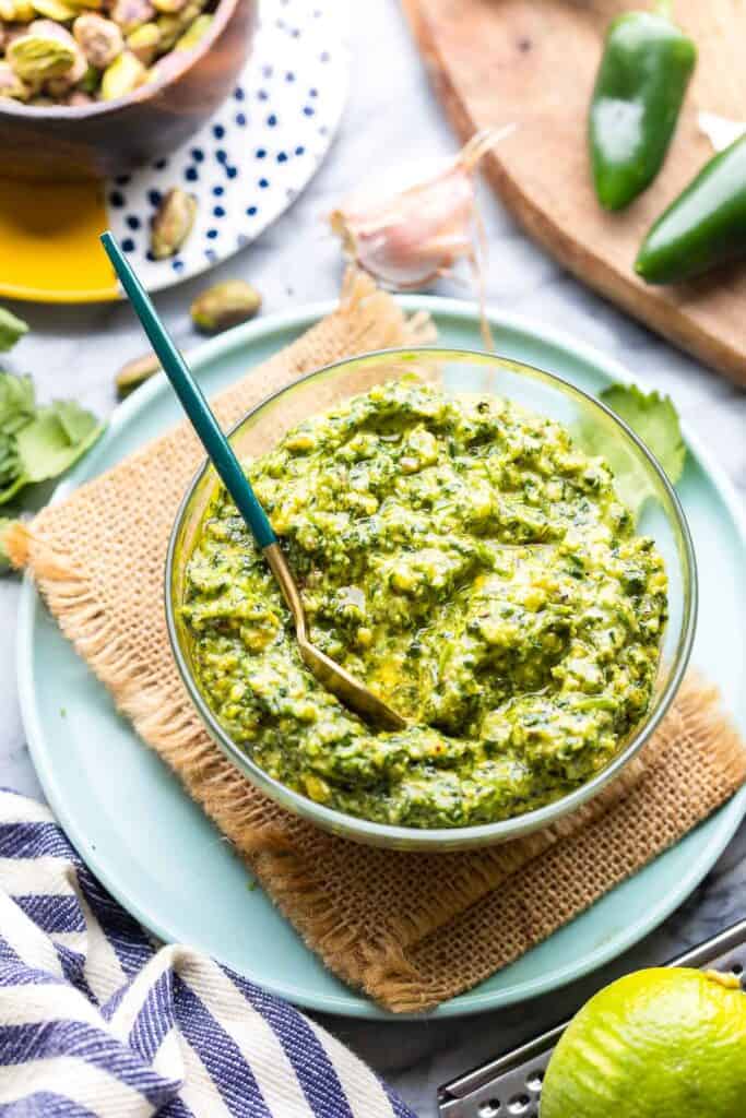 - Add the cilantro, pistachios, jalapeño, garlic, lime zest, lime juice, salt and pepper to the bowl of a food processor or blender. Blend or pulse until the ingredients are all finely chopped and well combined. Stop and scrape down the sides of the bowl as needed.