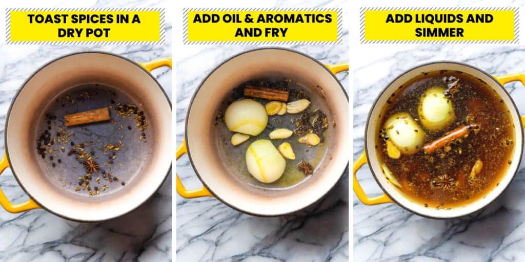 - Toast Spices: Add the whole spices to a dry pot and toast for a 1-2 minutes until fragrant.
