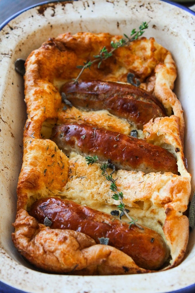 Freeze for later: Cool the toad in hole completely before double wrapping in plastic wrap and/or aluminum foil. Make sure to cover completely and tightly to prevent freezer burn. To cook from frozen preheat your oven to 425°F/ 220°C. Unwrap and place the toad in the hole on a baking sheet. When the oven is up to temperature bake for 25-30 minutes or until pipping hot. The internal temperature of the sausages should be 160°F/71°C