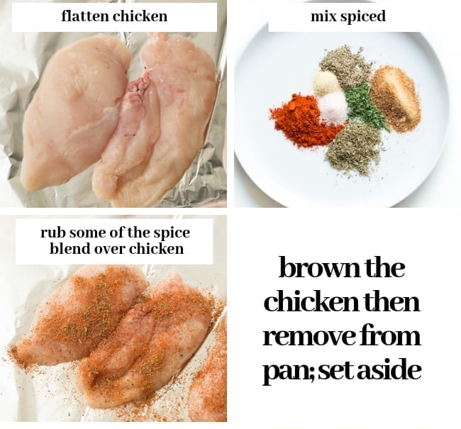- Sear: Add chicken to a hot skillet and cook both sides a few minutes until brown then set aside.